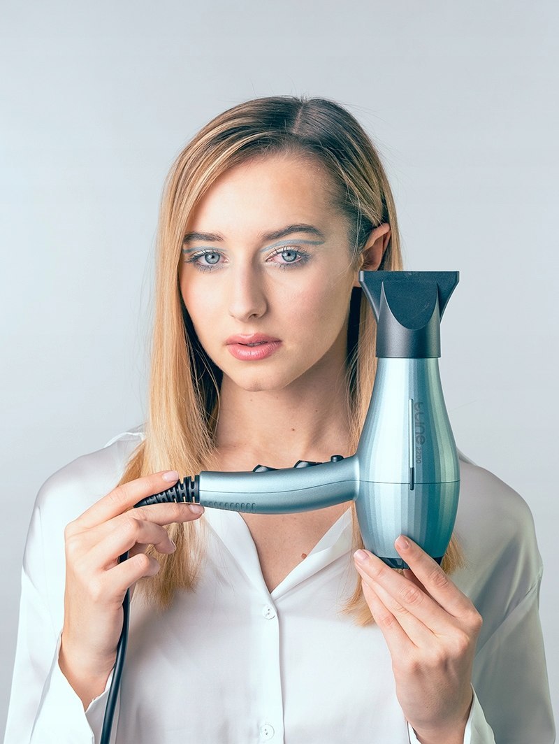 Podczas suszenia włosów trzymaj suszarkę w odległości co najmniej 20 cm od włosów. Skieruj strumień powietrza w jednym kierunku – od nasady aż po końce, co zapewni gładkość zewnętrznych warstw.