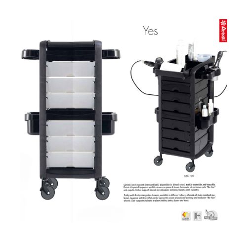 Estetyczny wózek na kółkach, z 6 szufladami , wszystkie wysuwane, wymienne, wyposażone w wewnętrzne przegrody. Wózek wyposażony jest w boczne wsporniki do suszarek do włosów oraz na miseczki lub butelki z kosmetykami.