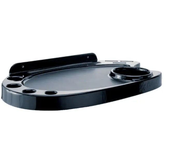 Posiada otwory na pędzle, grzebienie, suszarkę do włosów oraz miejsce do pracy lub na kosmetyki fryzjerskie.