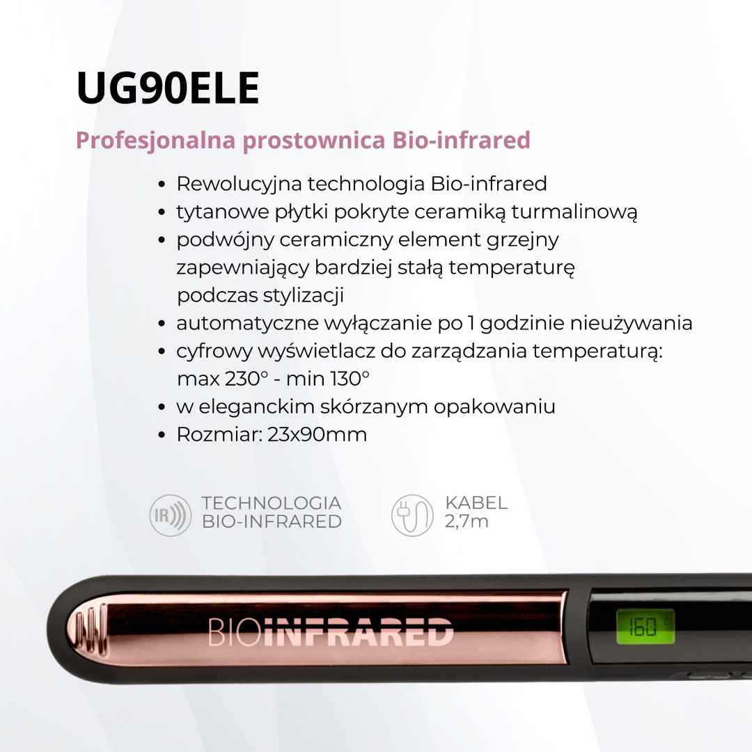 Prostownica UG90ELE posiada płytki tytanowe pokryte powłoką ceramiczno-turmalinową, co gwarantuje wysoką jakość i trwałość produktu. Jej wymiary 25 x 110 mm czynią ją idealnym narzędziem do precyzyjnego modelowania, a zaawansowany system z cyfrowym wyświetlaczem umożliwia łatwą kontrolę nad ustawieniami temperatury do maksymalnie 230°C.